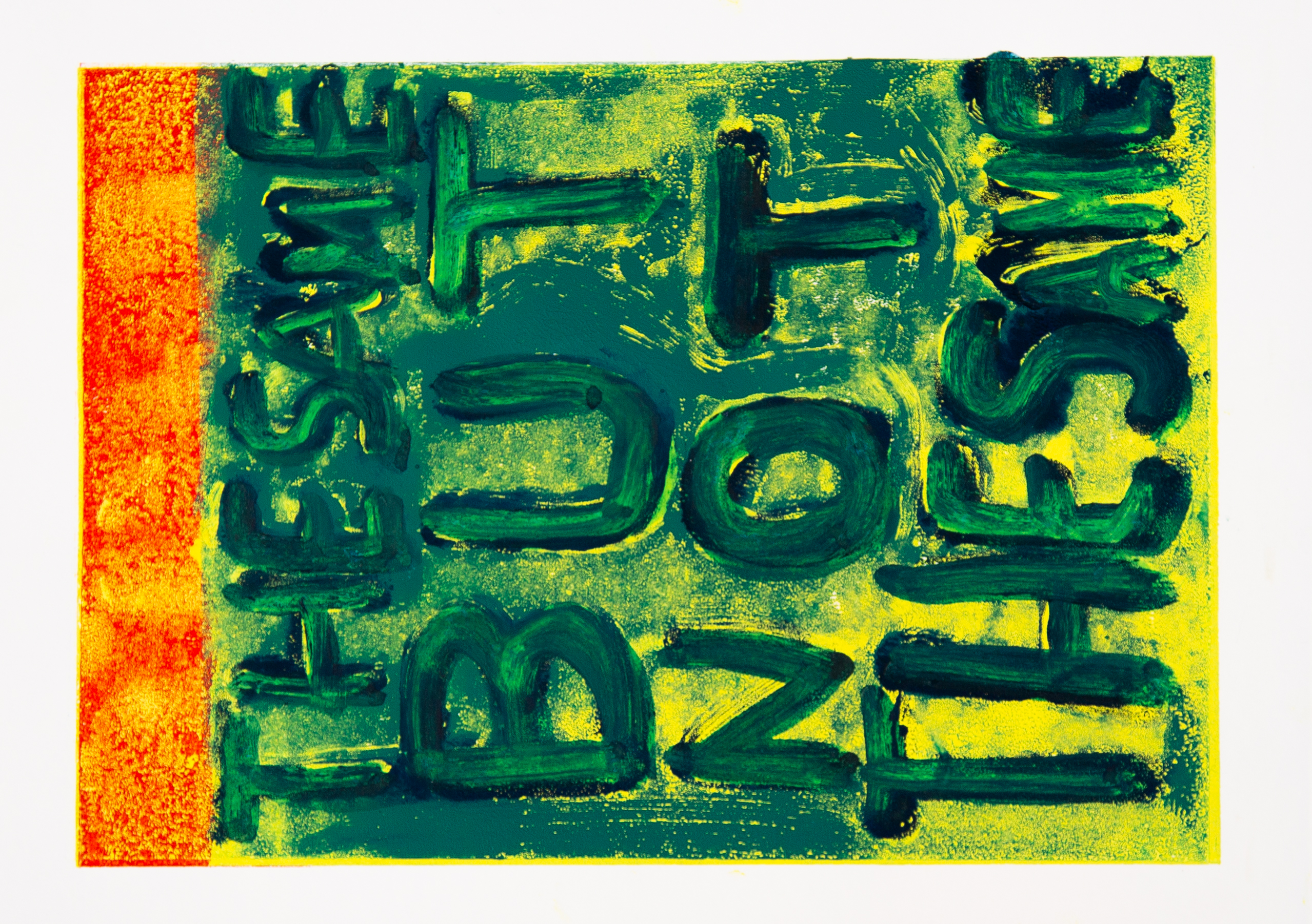 ‘The same but not the same’ is a series of monoprints, that close a series of performances. Exploring the technique’s characteristics, that make it impossible to reproduce an image, the same sentence was repeated over and over again, making each print unique. Alongside the prints, a book of monochromatic monoprints was developped, printed directly on each page.